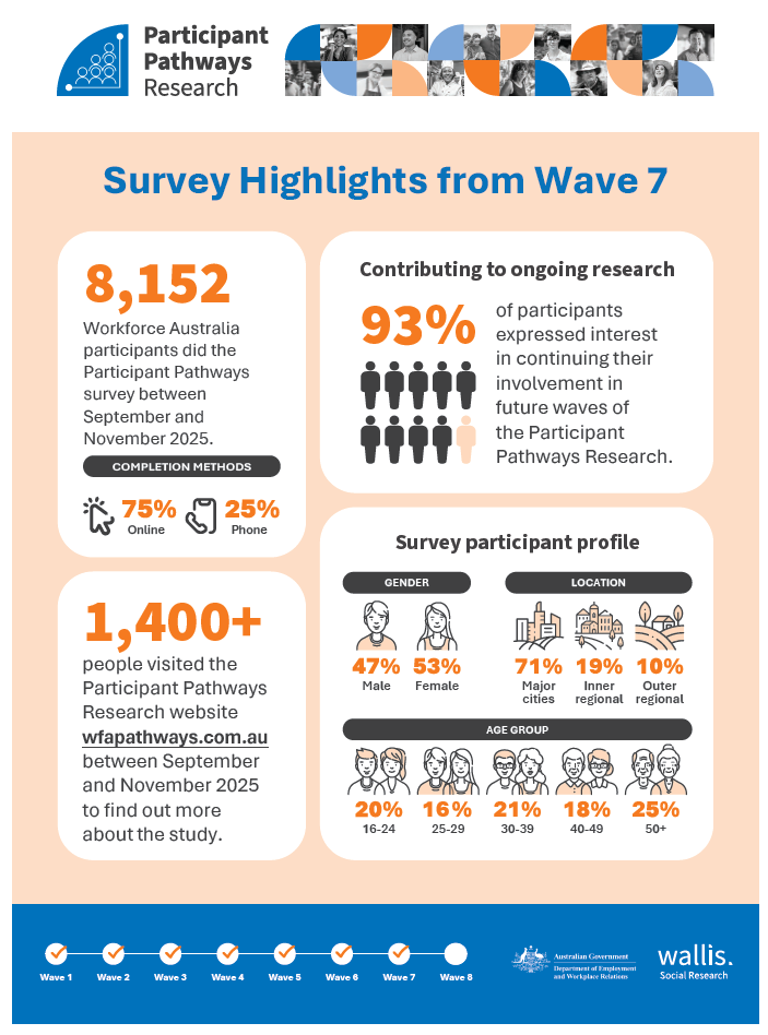 The Participant Pathways Research explores how people use Workforce Australia employment services over time. The research follows people over 4 years to understand how their employment circumstances and lives change and how these changes influence service demands, engagement, and satisfaction. The research will be used to improve employment services in Australia.